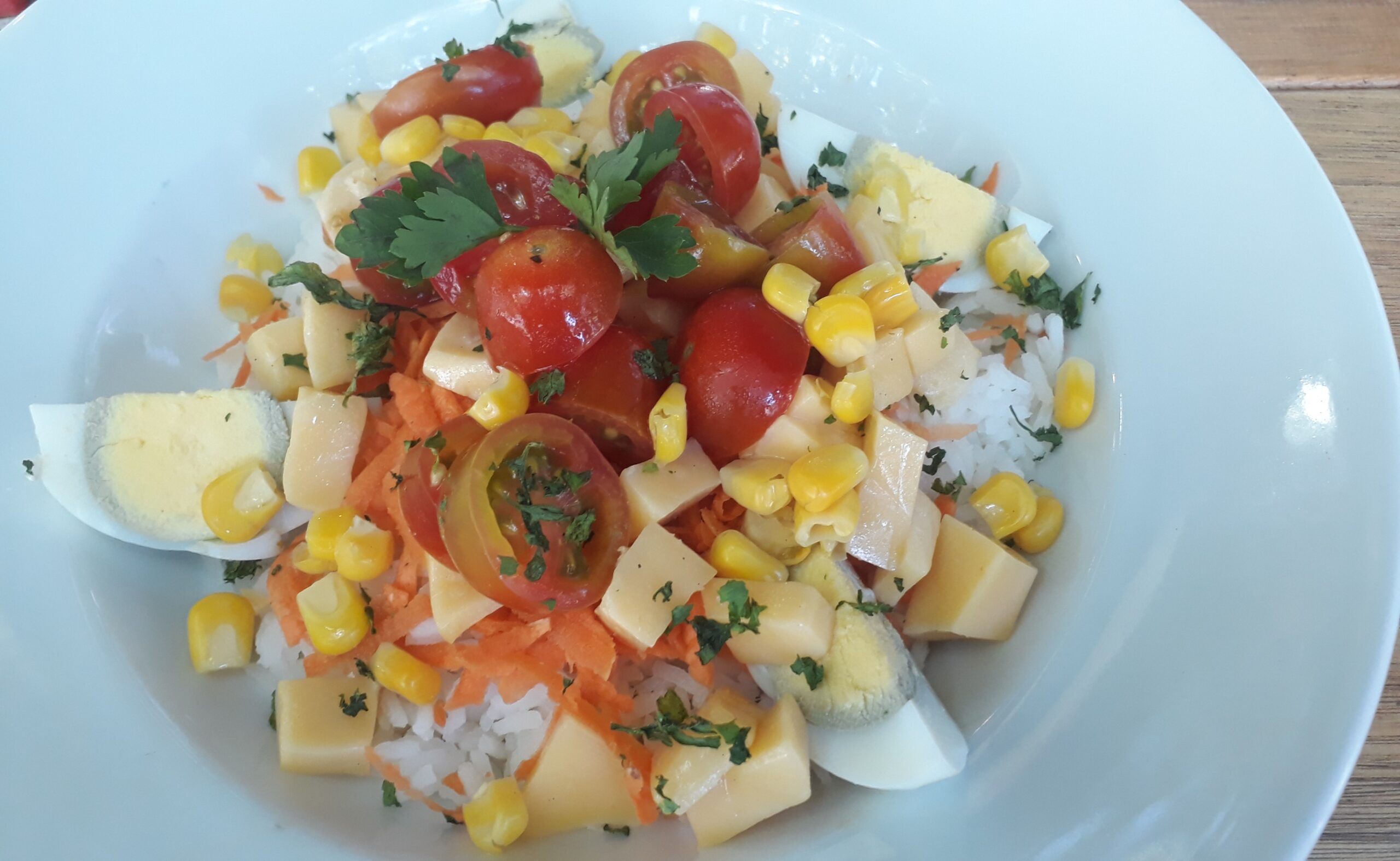 Arroz, Choclo, Queso en cubos, Tomastes cherry, Zanahoria y Huevo duro